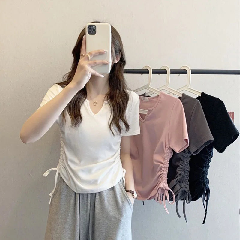 1pcs Summer Women T-shirt Girl Basic TShirt Lady Short Sleeve Sexy Slim Fit Drawstring Tee V-Neck Women's Casual Tee Student Top
