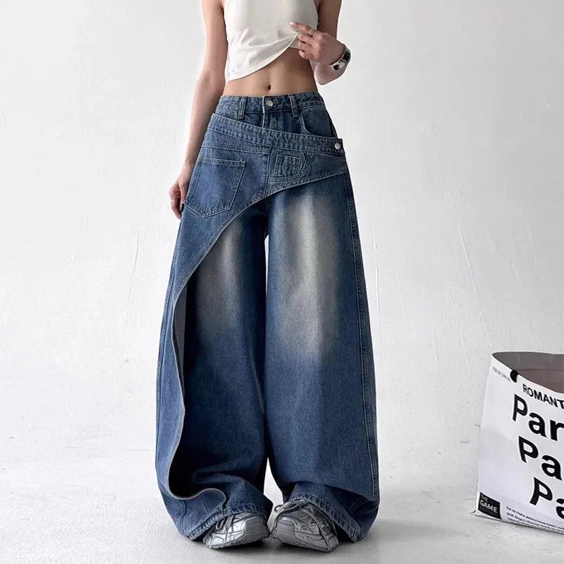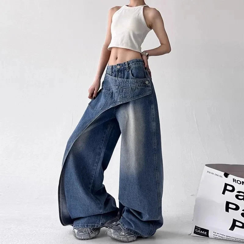 Y2K Fashion Irregular Patchwork Jeans Women Korean Chic Streetwear Hip Hop Straight Trousers Bf High Waist Casual Denim