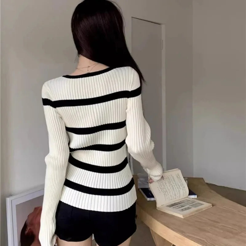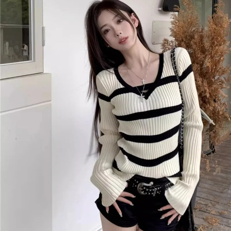 Women Clothes Spring Autumn Fashion Simplicity Trend Striped Color Blocking V-neck Knitting Female Temperament Sweater Pullovers