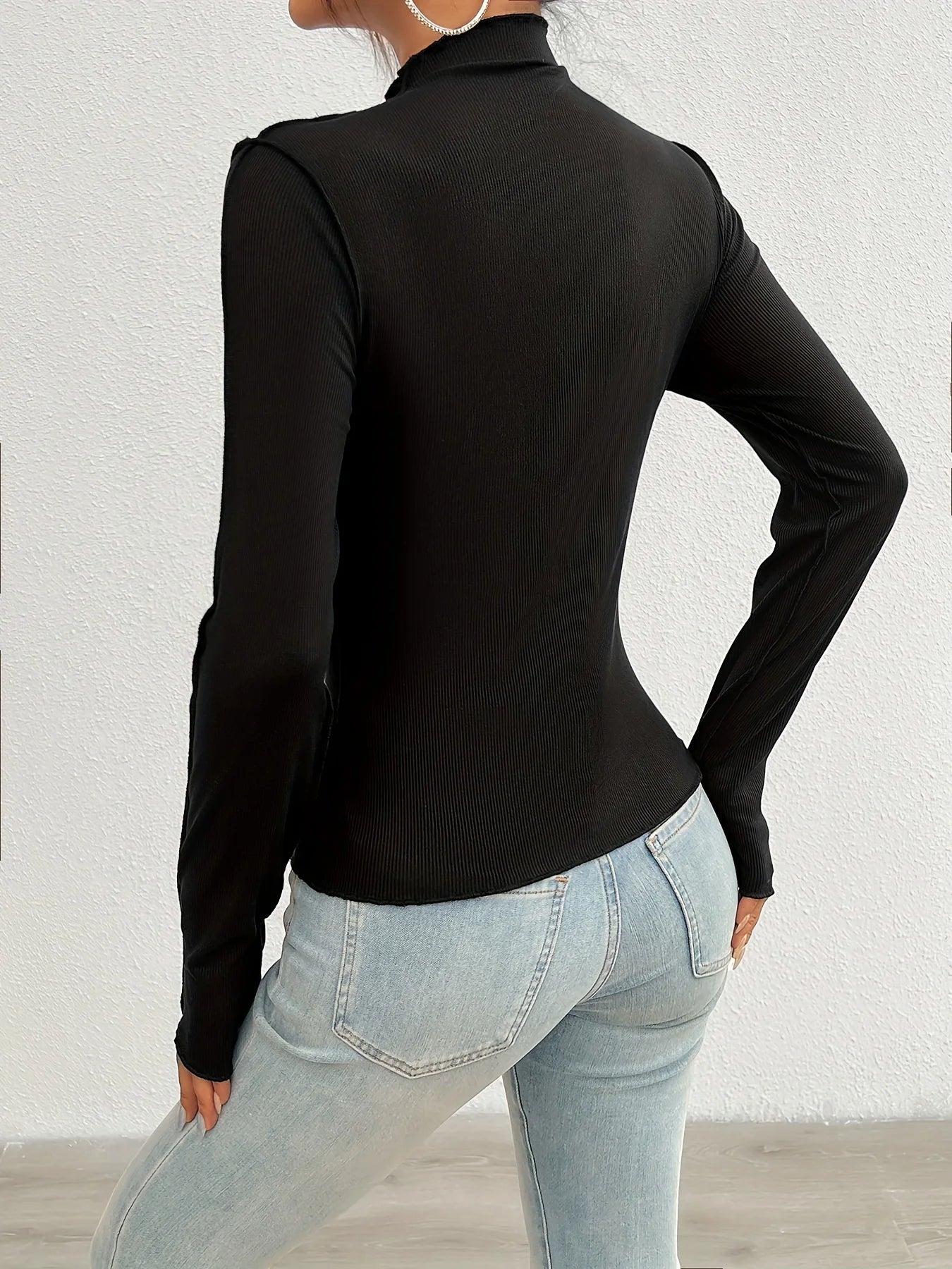 Small high neck wavy edge long sleeved black T-shirt top for women
