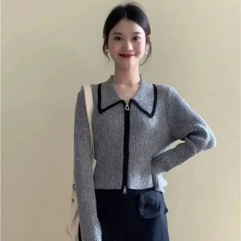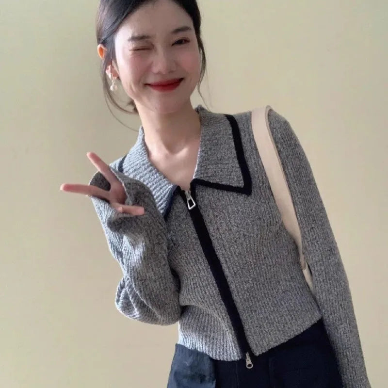 Women Clothing Spring Autumn Fashion Korean Zipper Solid Color Polo Collar Female Simplicity All-match Temperament Chiffon Cardi