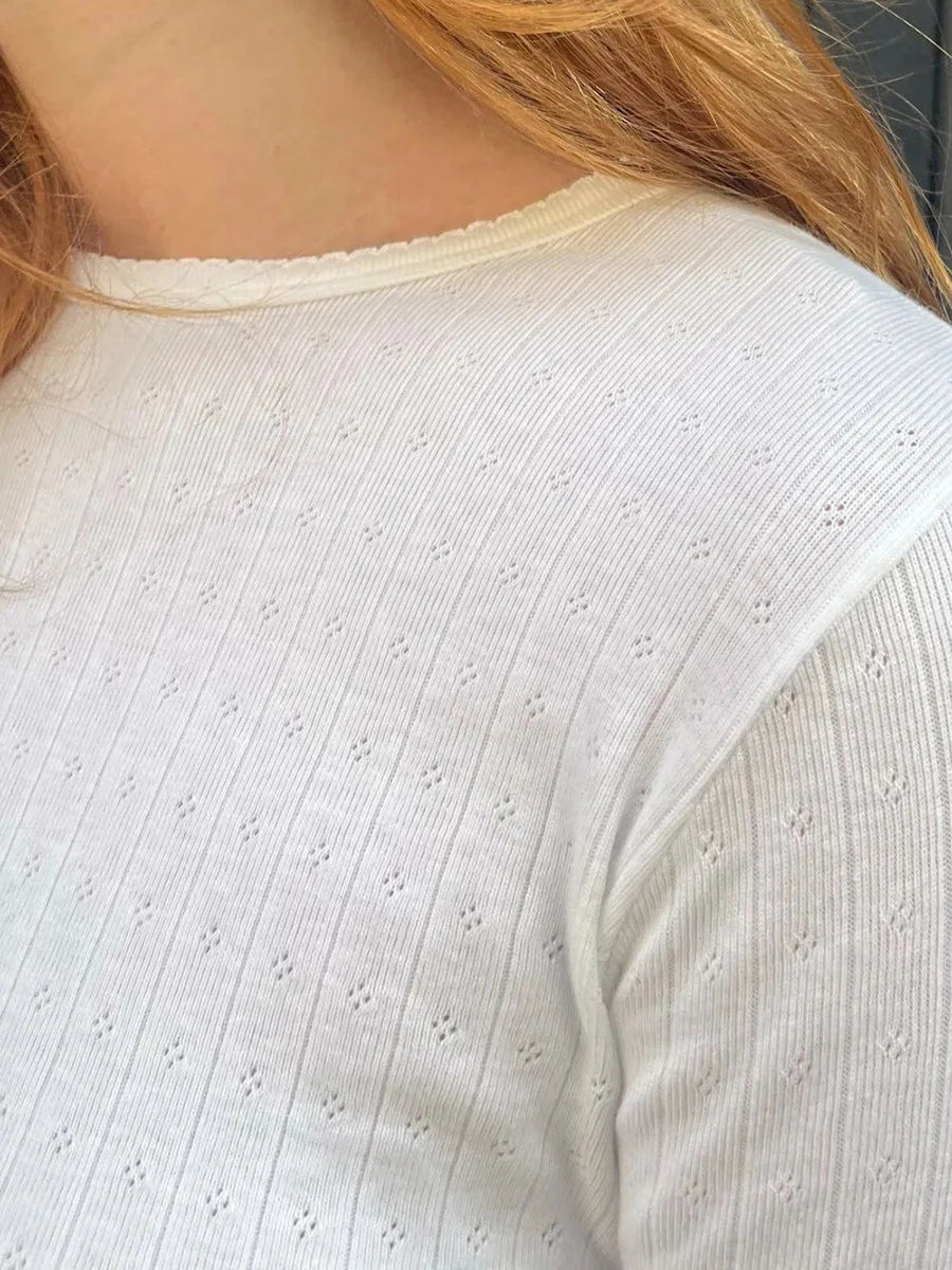 White Eyelet Slim Basic Long Sleeve T-Shirts Women Lace Trim Round Neck Cotton Casual Tee Shirts Vintage Simple Tshirts Y2k Tops