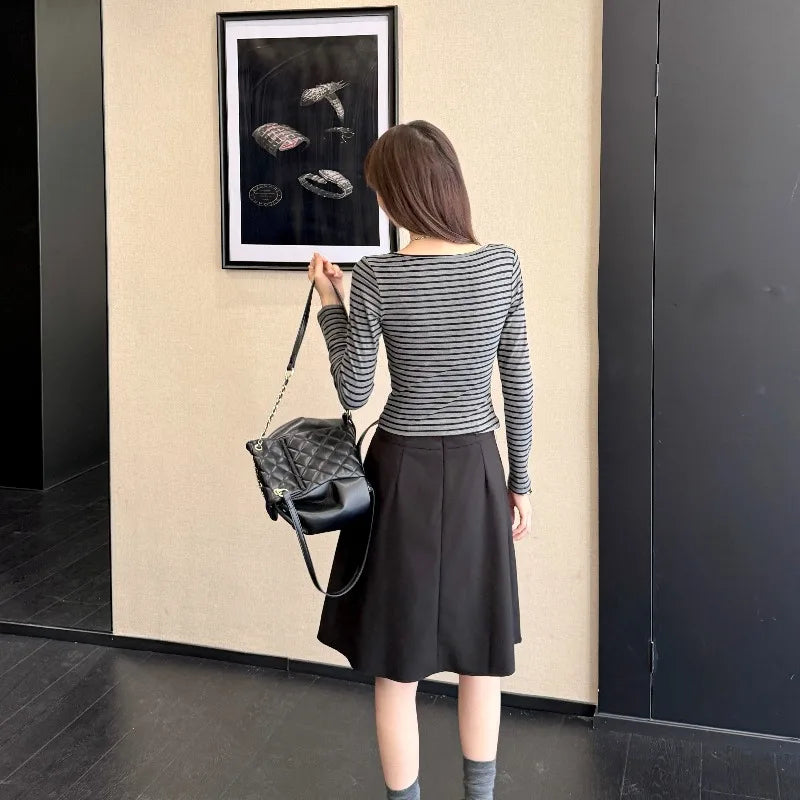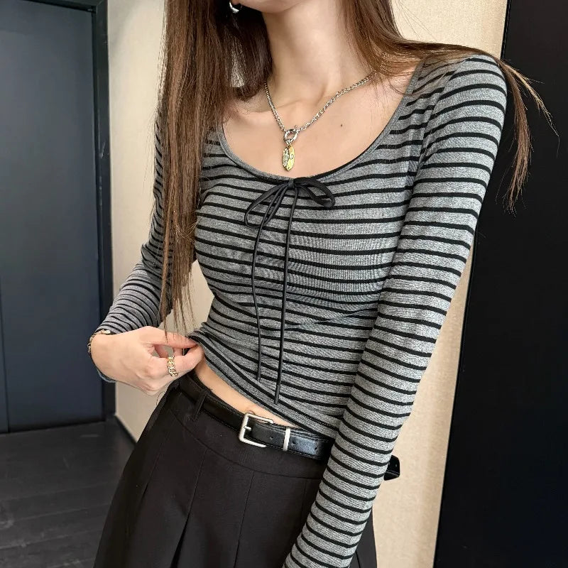 Autumn Winter Vintage Striped Women's T-shirts Knitted Long Sleeve U-neck Korean Bottom Casual Shirts Slim Tops Female 2025 New