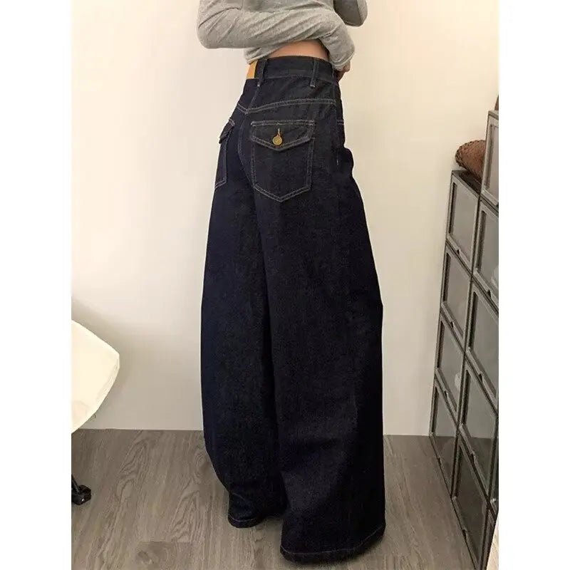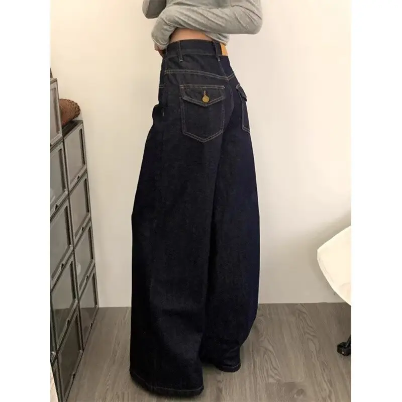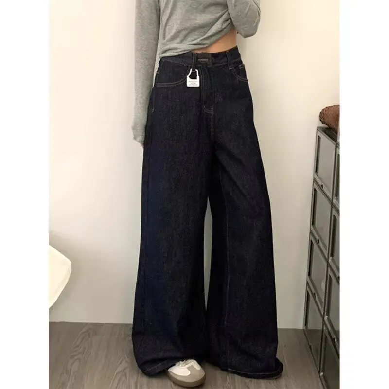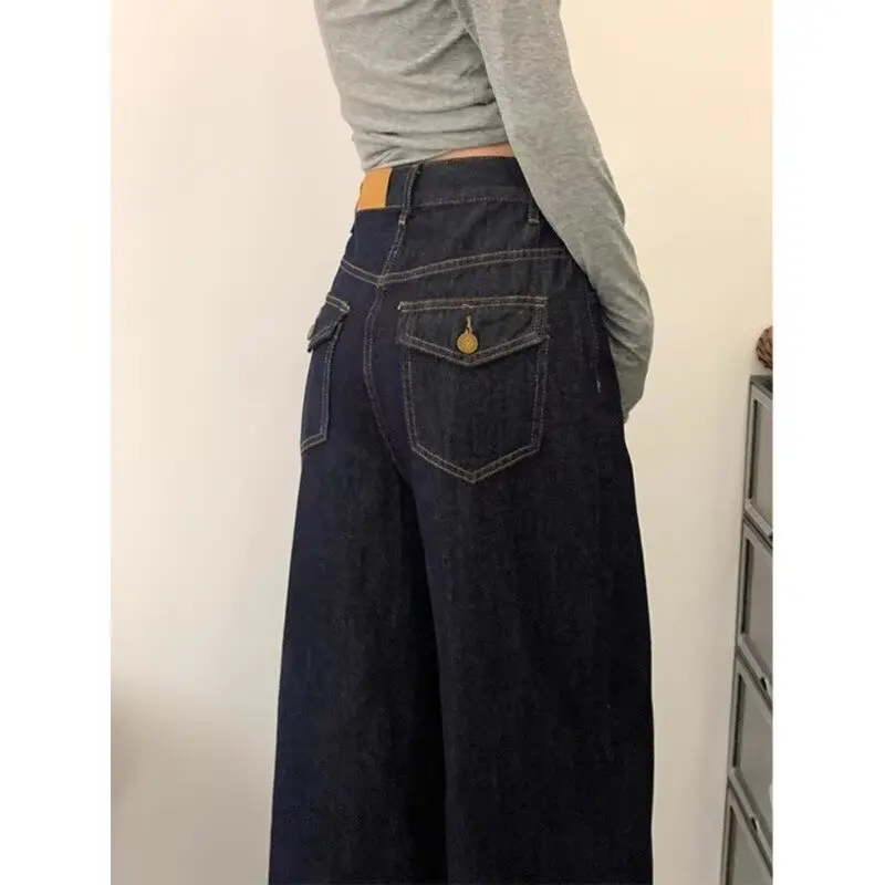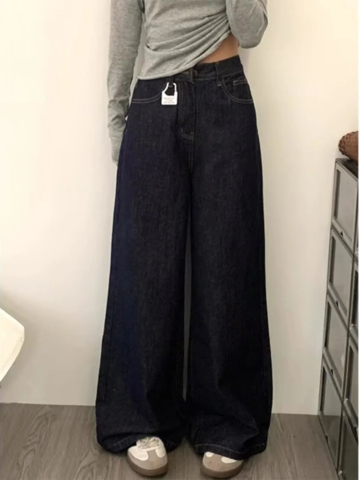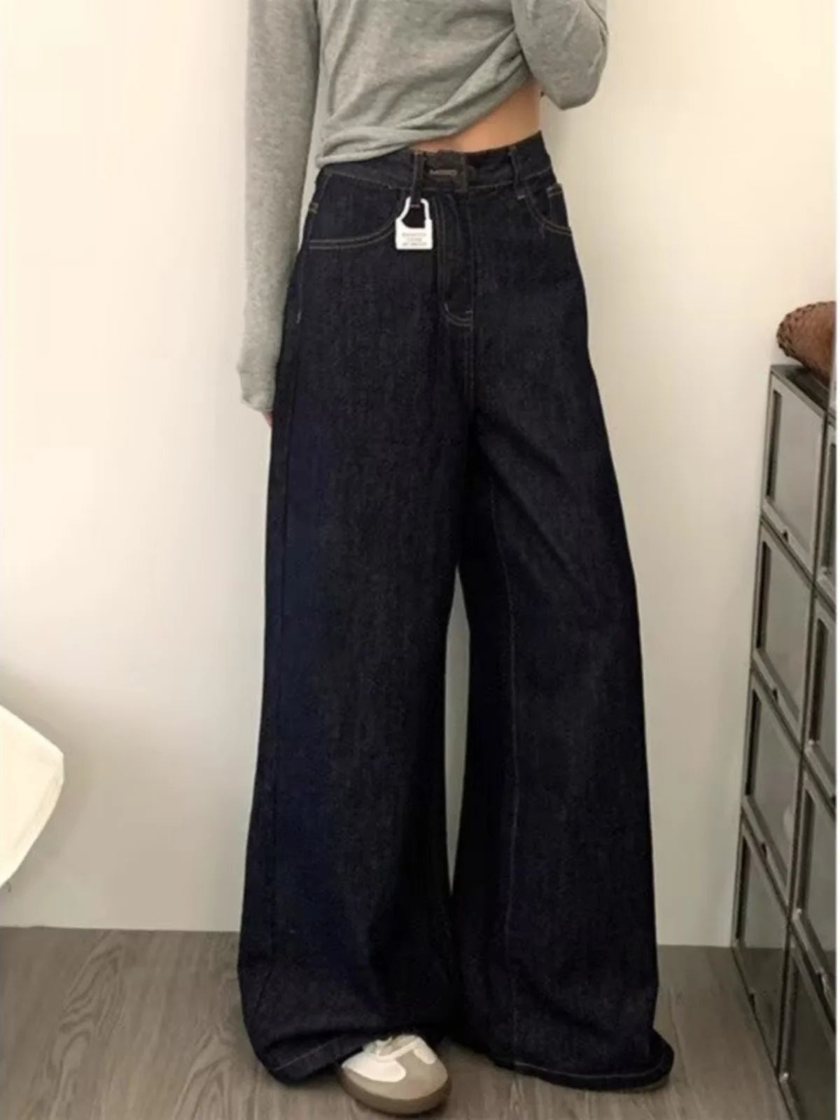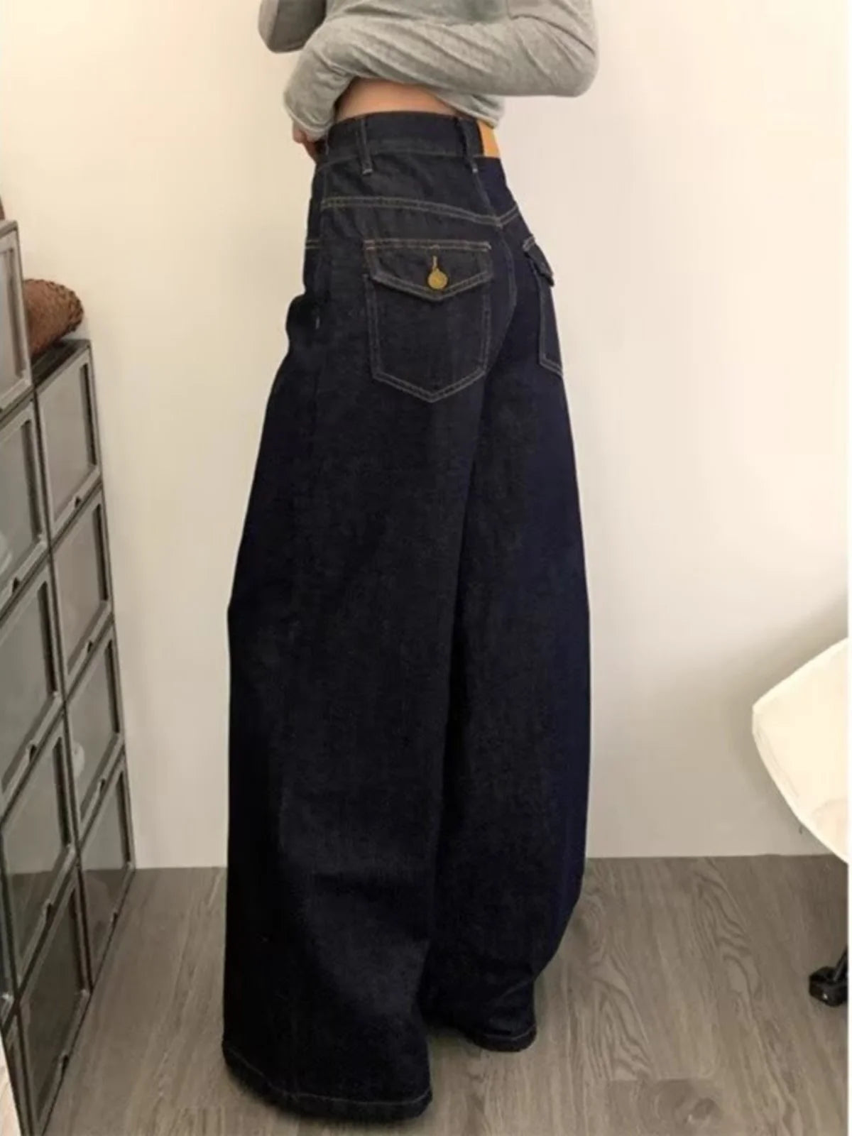 Embrace retro charm with these deep blue wide-leg jeans, perfect for adding a touch of vintage flair to your wardrobe.
