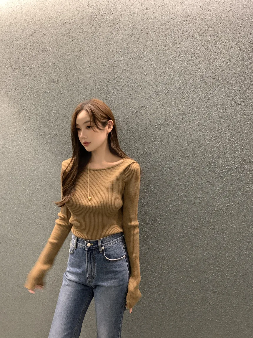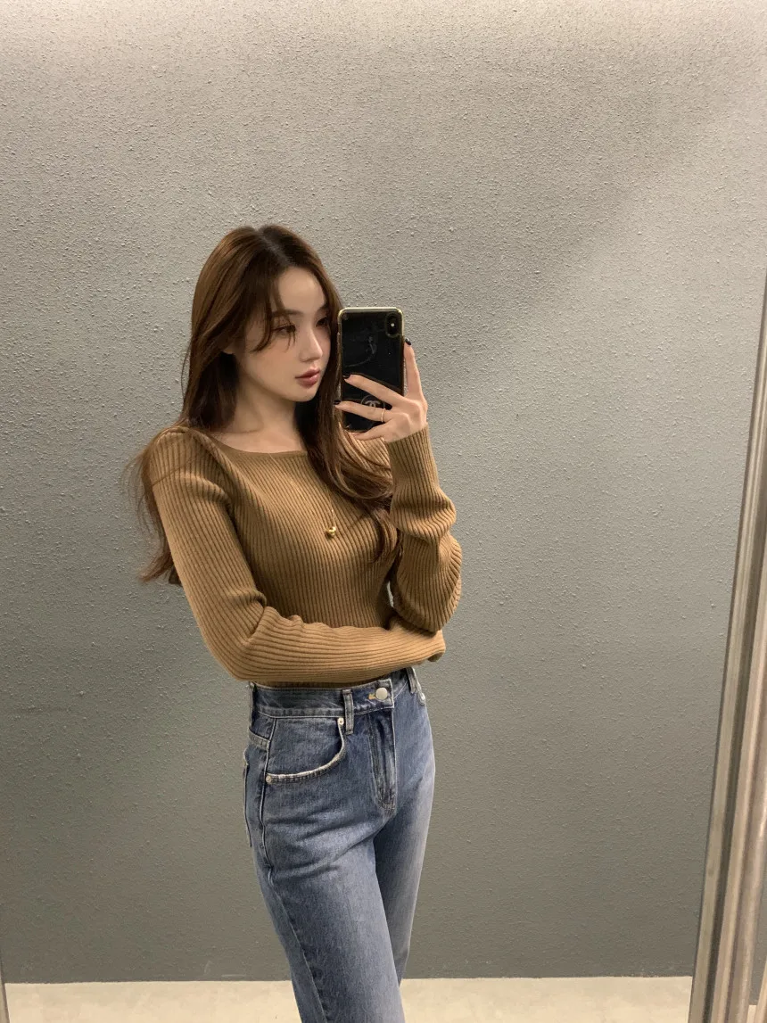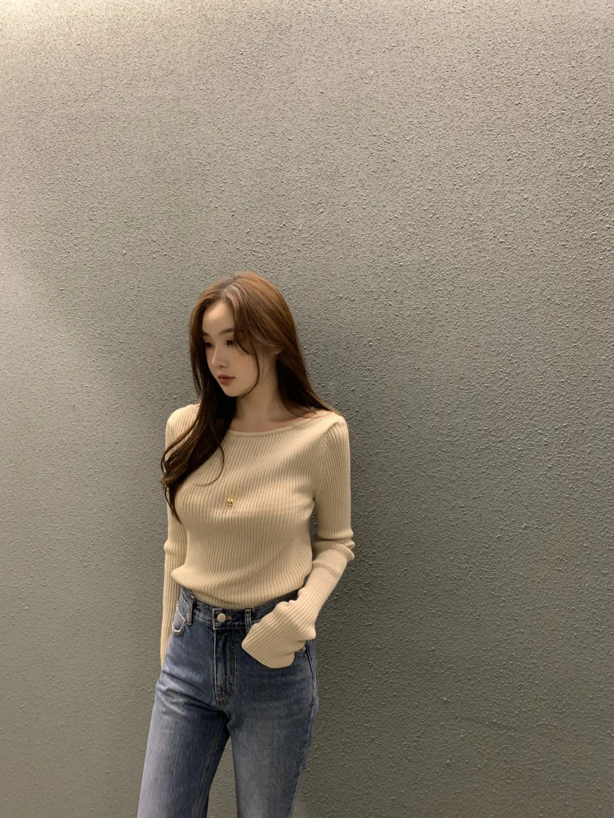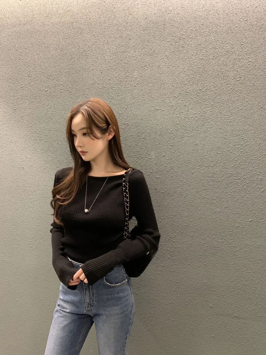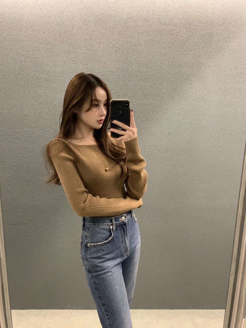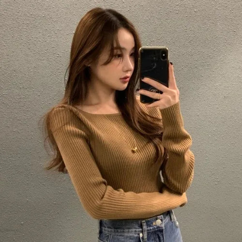 Embrace the latest Korean fashion trend with this chic, minimalist one-shoulder knit sweater, perfect for autumn.
