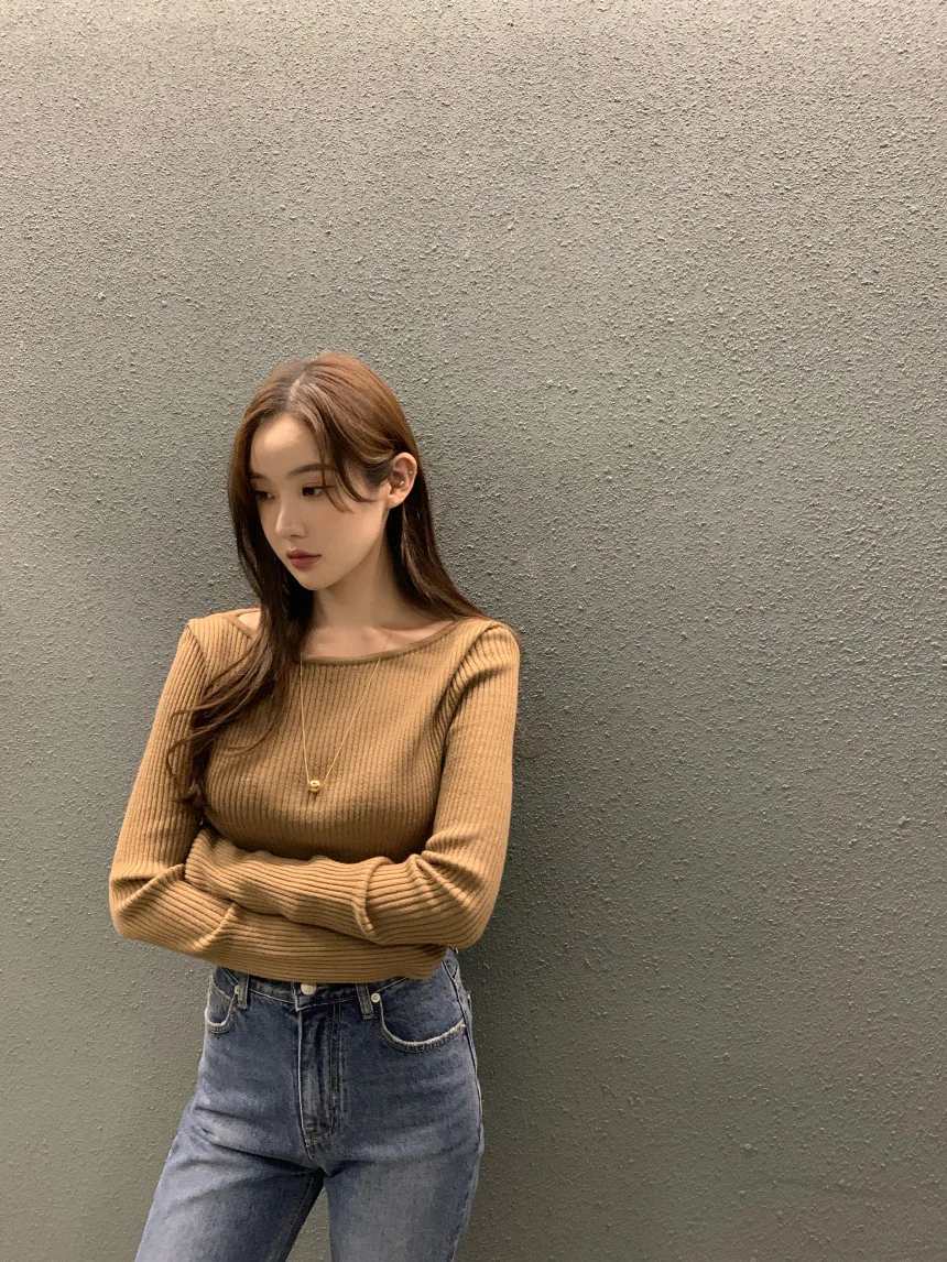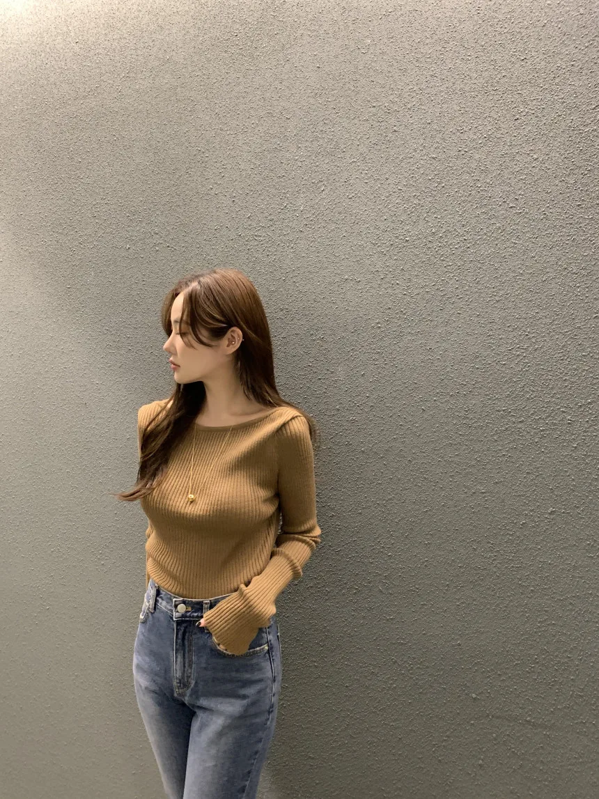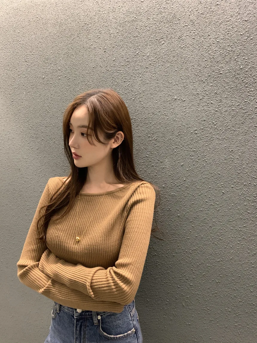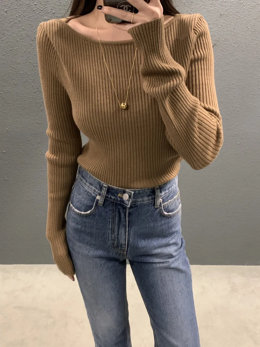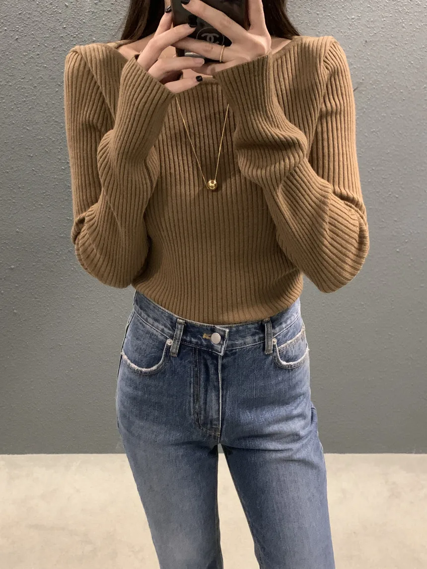 Embrace the latest Korean fashion trend with this chic, minimalist one-shoulder knit sweater, perfect for autumn.