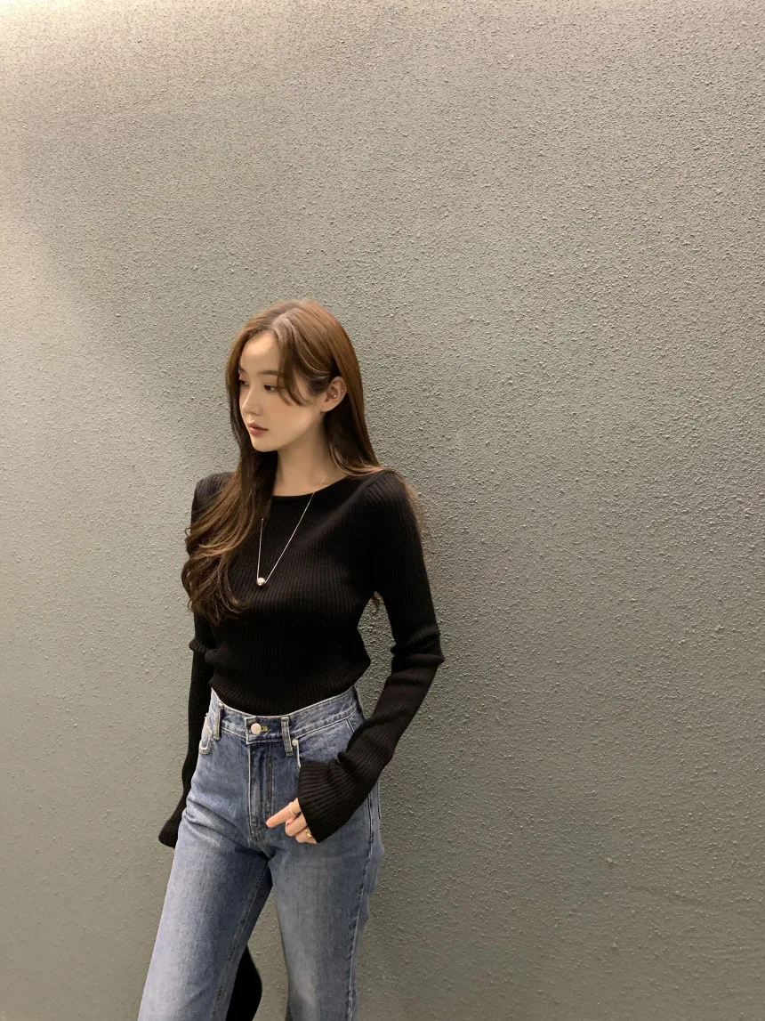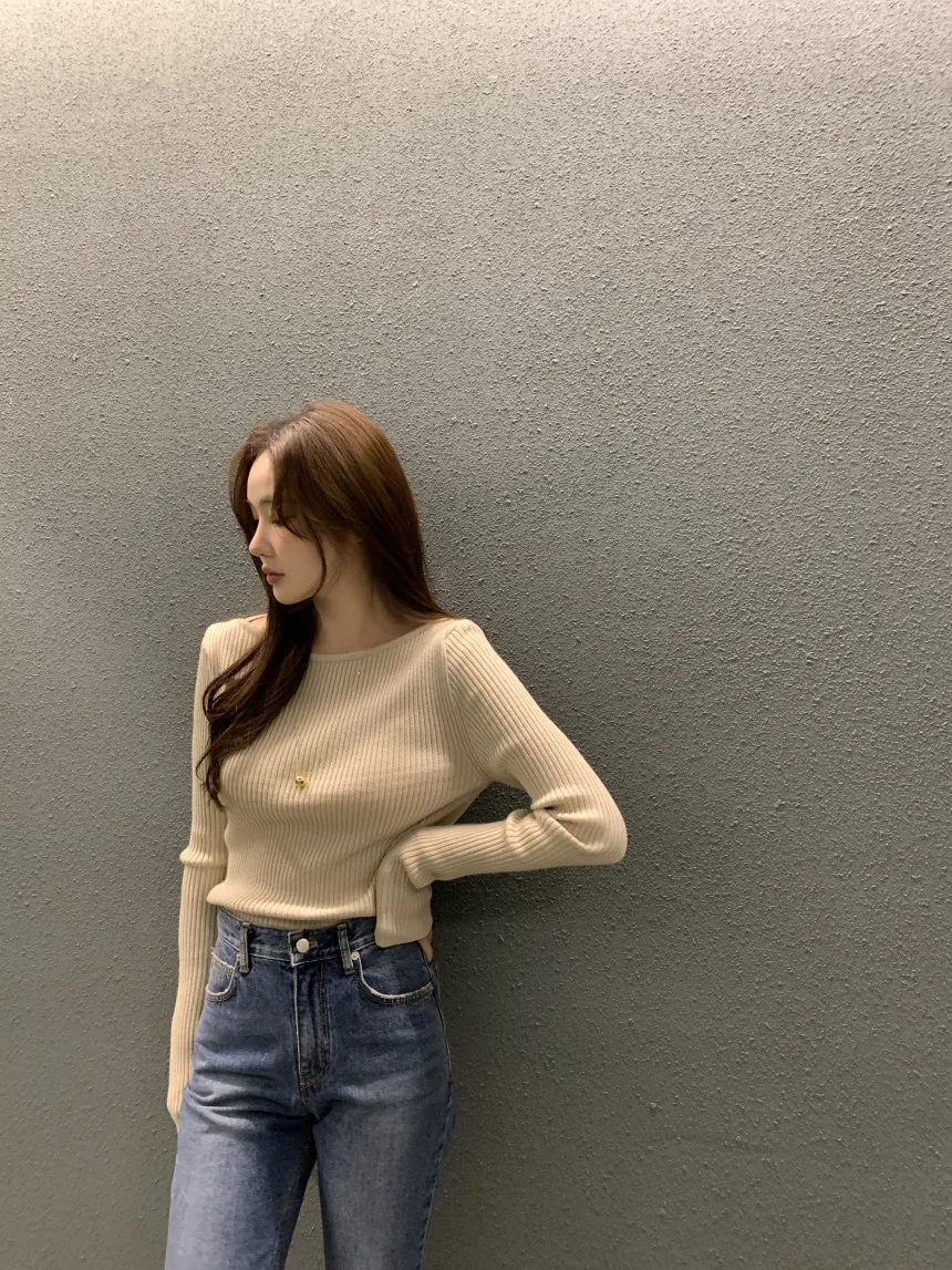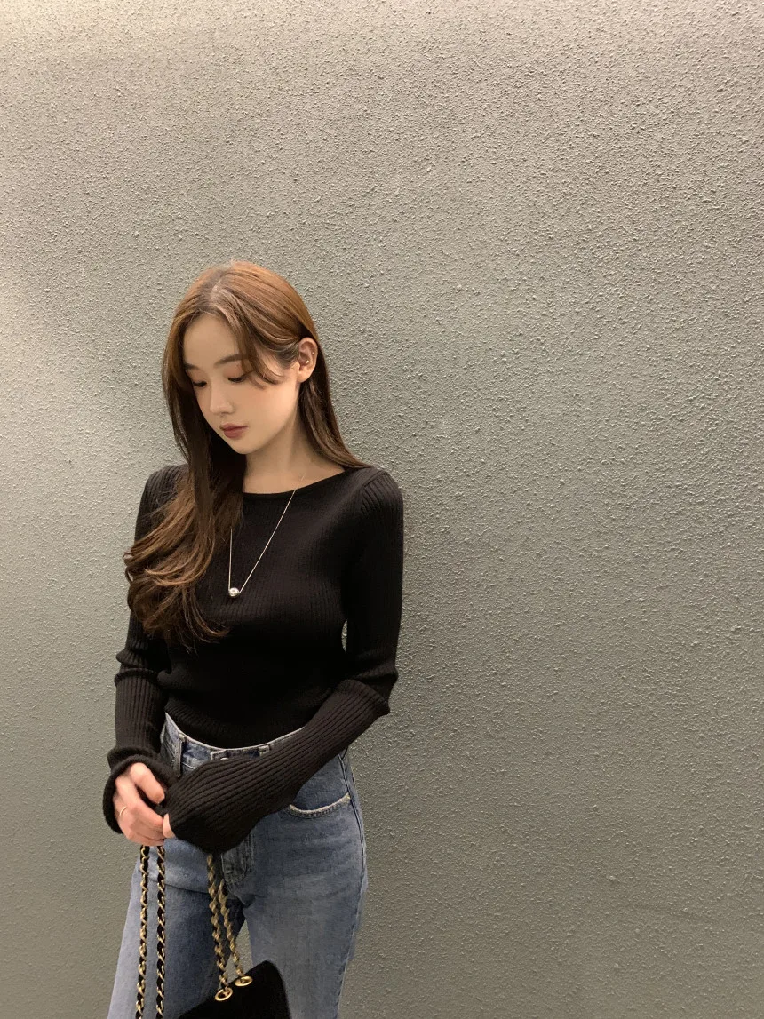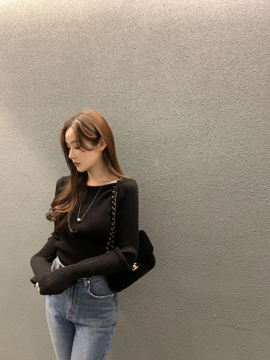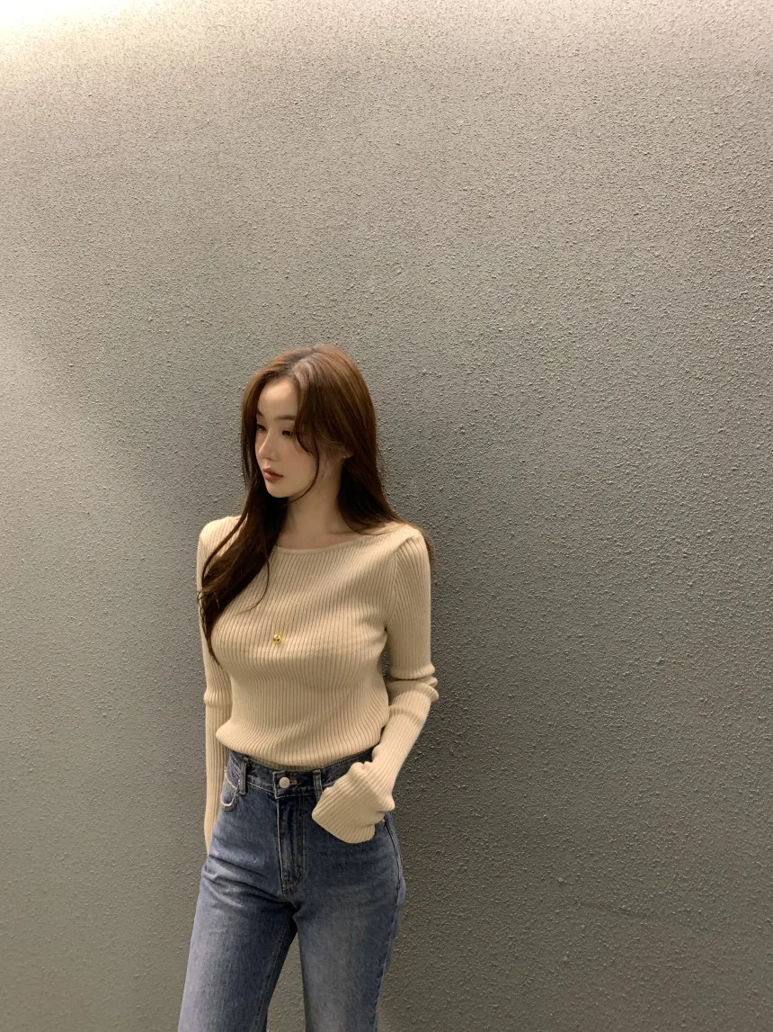 Embrace the latest Korean fashion trend with this chic, minimalist one-shoulder knit sweater, perfect for autumn.