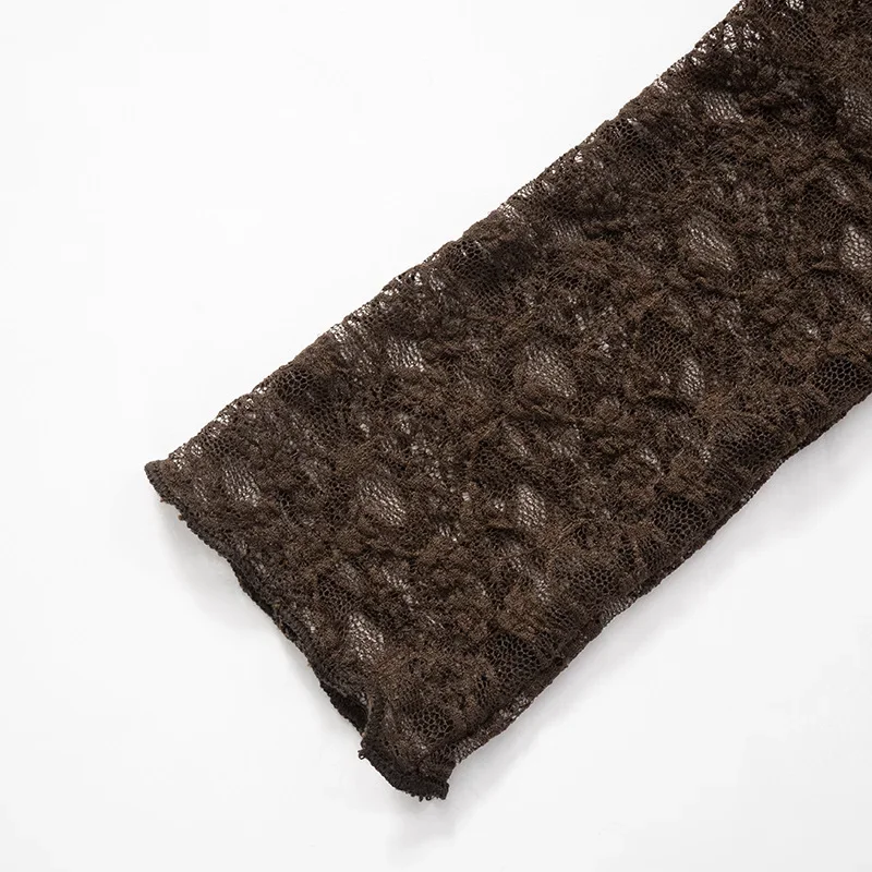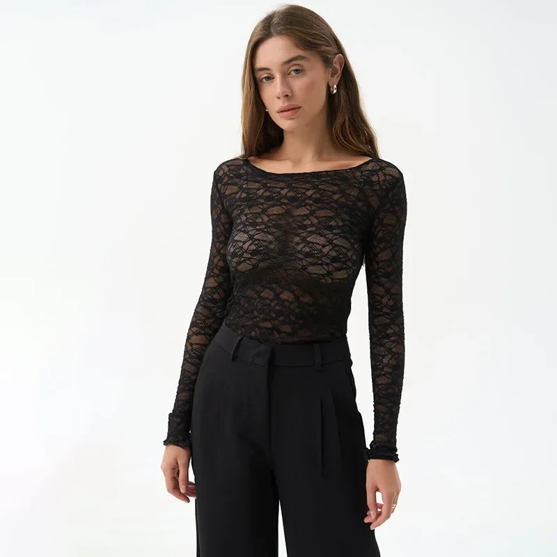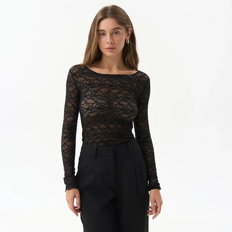 Long Sleeve T Shirts For Women Aesthetic Clothes O-neck Ropa Mujer See Through Lace Crop Top Slim Fit Camisetas Y2k Accessories