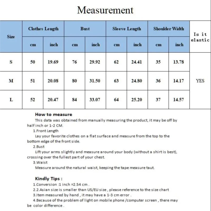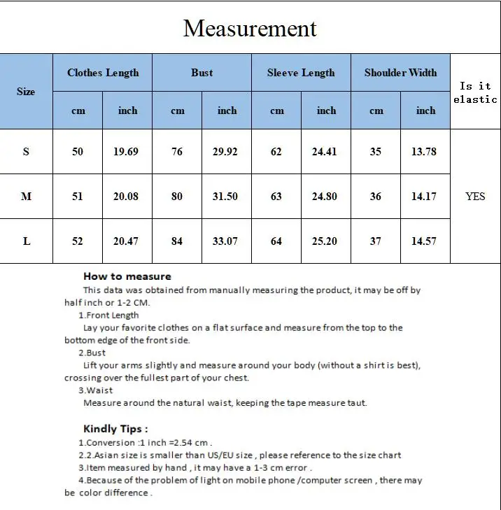 L:Shoulder:37cm,Bust:84cm,Sleeve:64cm,Tops Length:52cm.